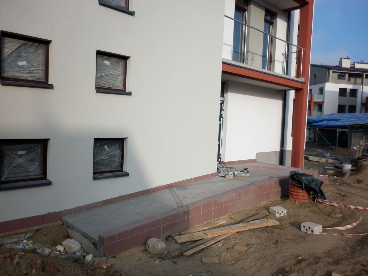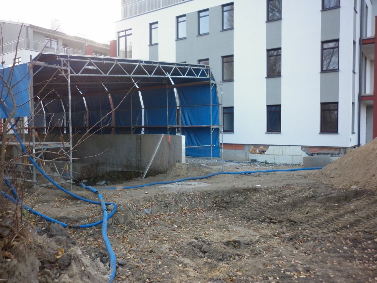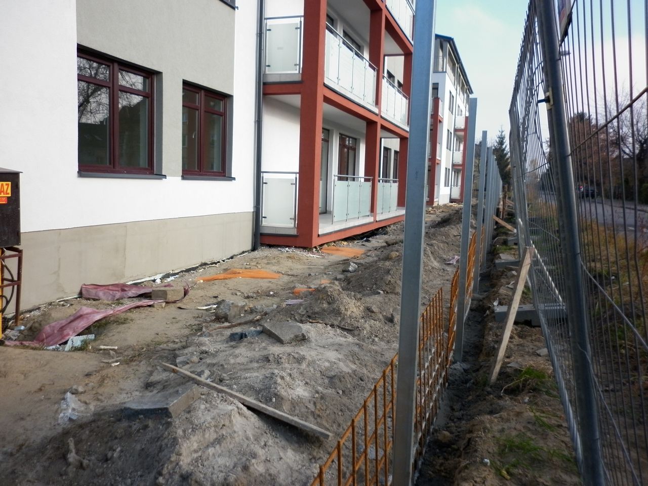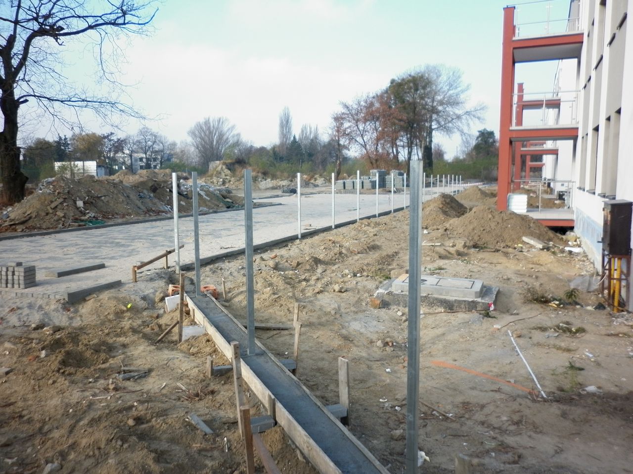 Niedzielna poranna wizyta na budowie. Widać było kilku pracujących ludzi. Jest gotowy fragment ogrodzenia przy budynku 9, słupki zamontowane wzdłuż ul. Szczęsnej i dalej zakręcają w stronę budynku 2 – jak na zdjęciach. Poza tym wiele detali, np. częściowo obłożony kafelkami podjazd dla wózków przy budynku 1, czy cokoły w budynkach od strony ul. Szczęsnej. Nie widać ani nie słychać żadnej aktywności dobiegającej z garaży, a wjazdy do nich zdają się być mało eksploatowane. W garażach pod budynkami 1-6 wody nie ma, pod 7-10 nie widziałem z ulicy – jest tylko zabłocony zjazd. Przy budynku 4 od strony torów prowadzone są głębokie wykopy, w których osadzono betonowe elementy. Prawdopodobnie są to zbiorniki na deszczówkę.