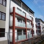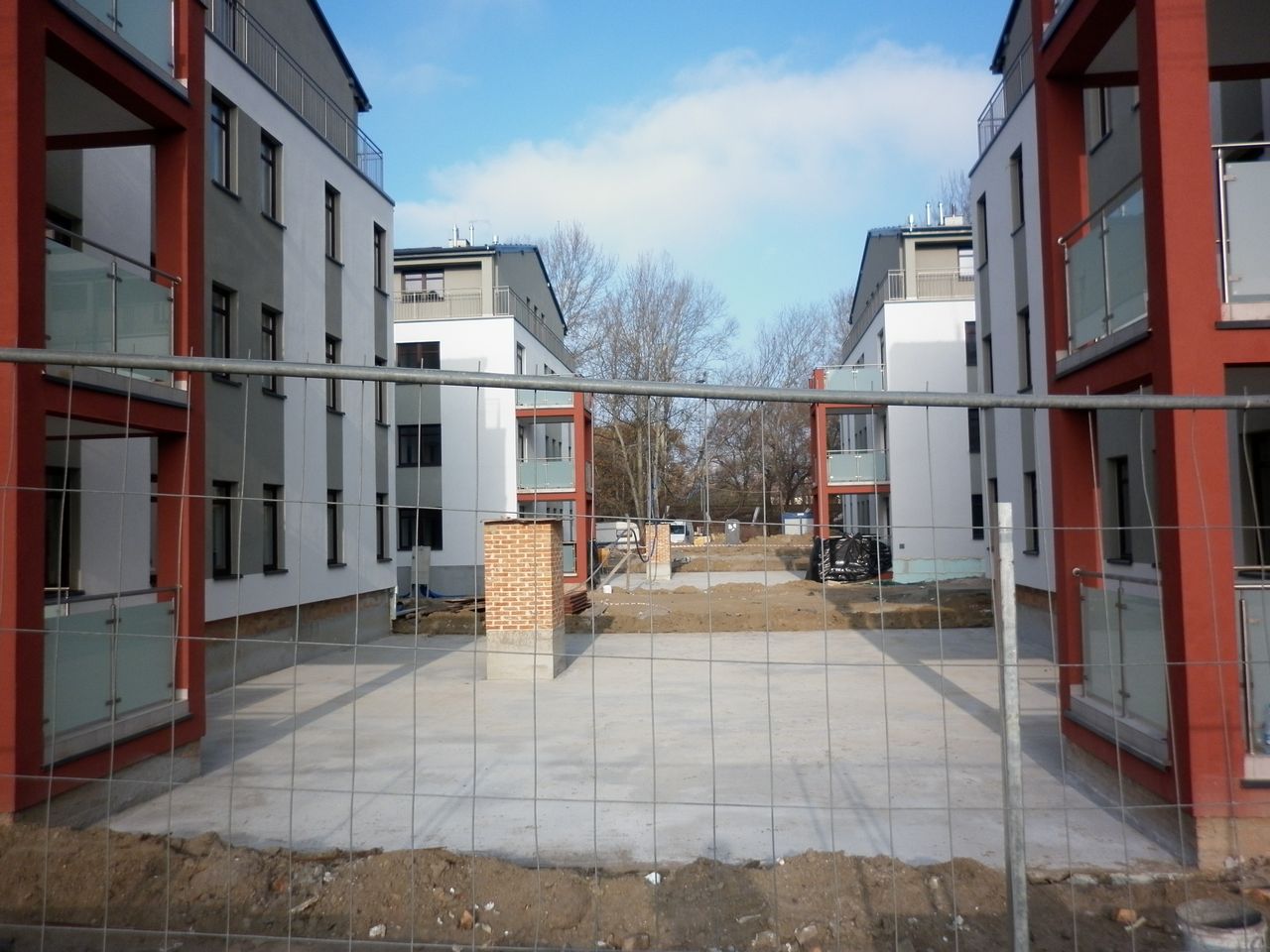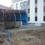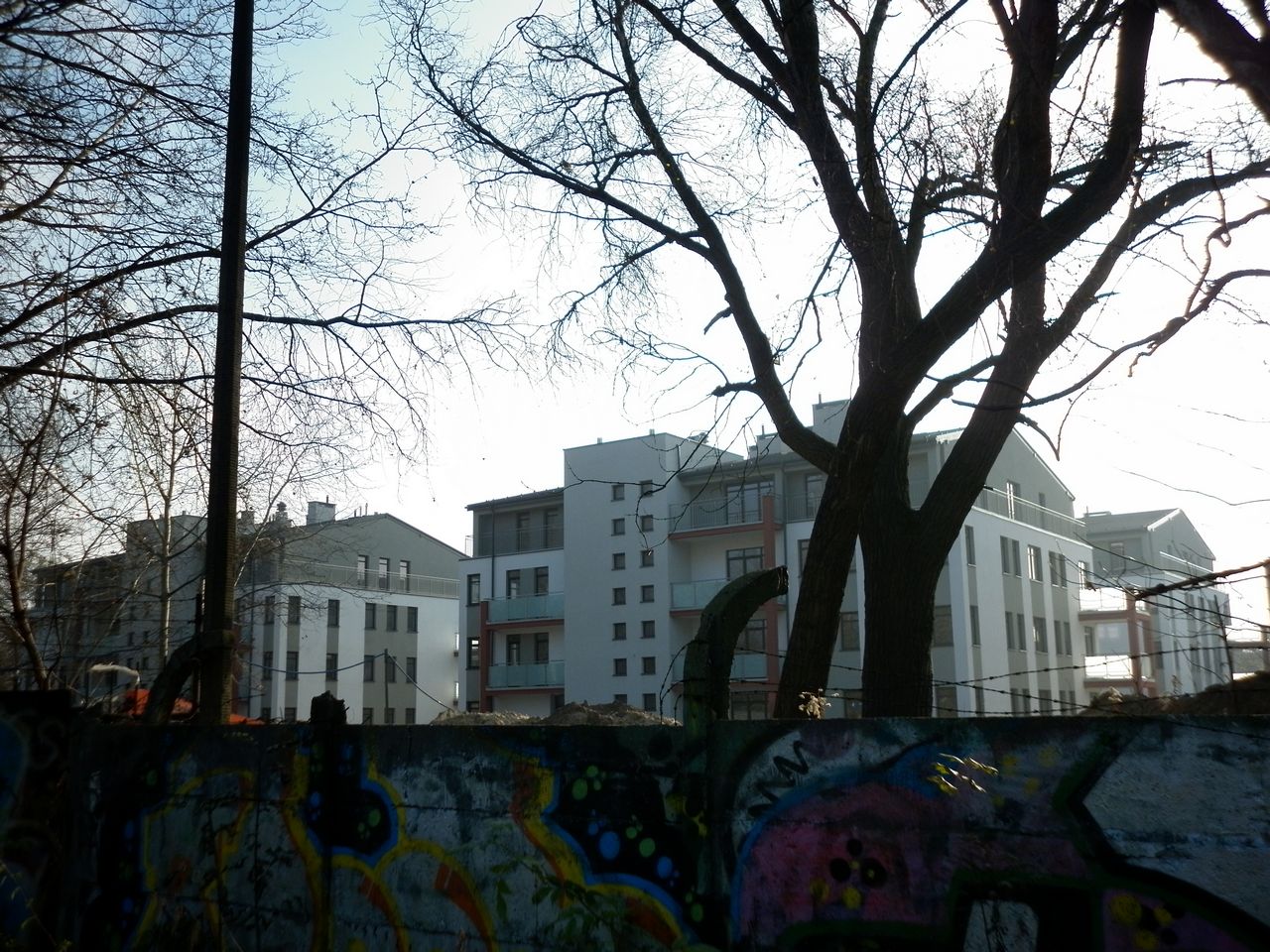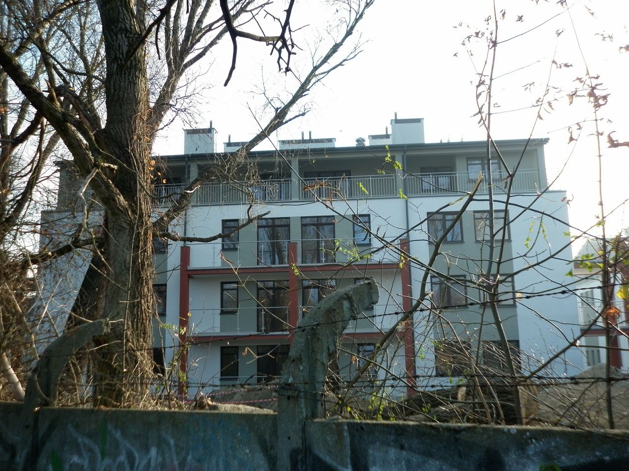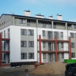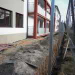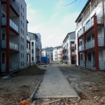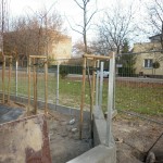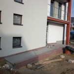 Niedzielna poranna wizyta na budowie. Widać było kilku pracujących ludzi. Jest gotowy fragment ogrodzenia przy budynku 9, słupki zamontowane wzdłuż ul. Szczęsnej i dalej zakręcają w stronę budynku 2 – jak na zdjęciach. Poza tym wiele detali, np. częściowo obłożony kafelkami podjazd dla wózków przy budynku 1, czy cokoły w budynkach od strony ul. Szczęsnej. Nie widać ani nie słychać żadnej aktywności dobiegającej z garaży, a wjazdy do nich zdają się być mało eksploatowane. W garażach pod budynkami 1-6 wody nie ma, pod 7-10 nie widziałem z ulicy – jest tylko zabłocony zjazd. Przy budynku 4 od strony torów prowadzone są głębokie wykopy, w których osadzono betonowe elementy. Prawdopodobnie są to zbiorniki na deszczówkę.